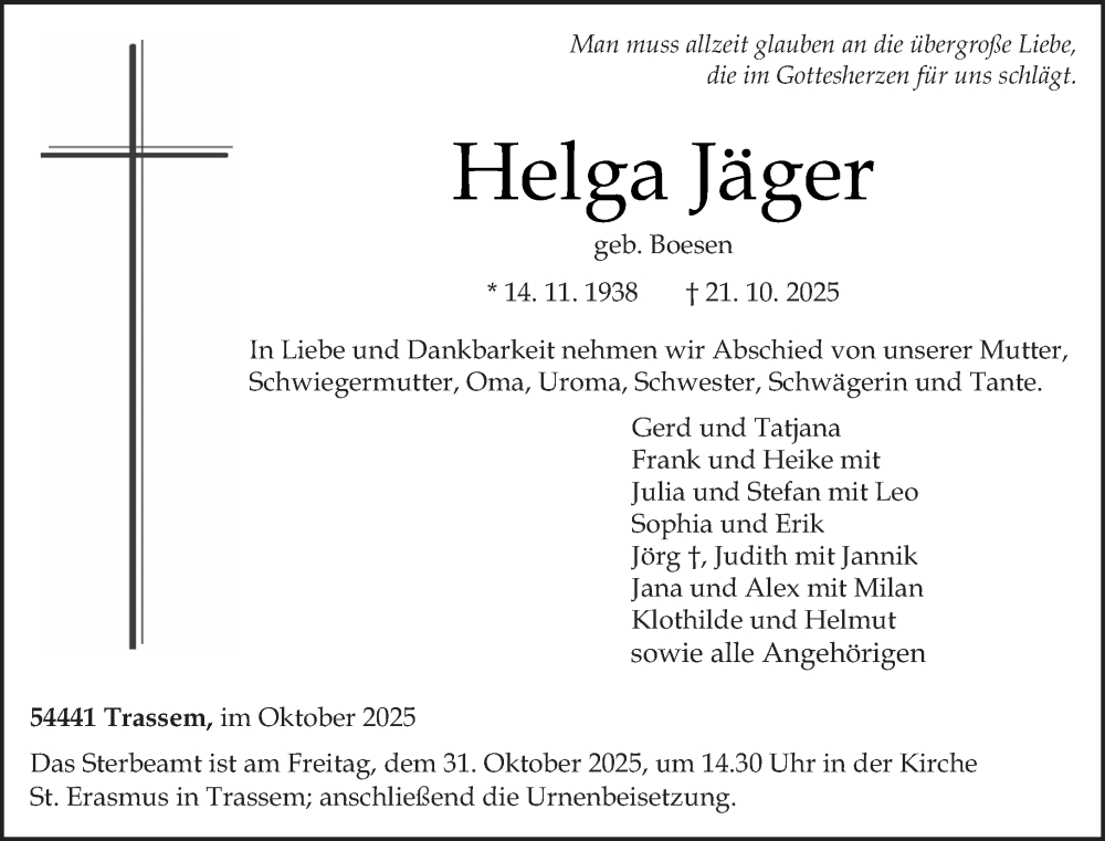 Hier finden Sie alle Traueranzeigen aus der Zeitung, die bisher für Helga Jäger erschienen sind. Weitere Traueranzeigen, die in der Zeitung erscheinen, werden hier ebenfalls aufgelistet