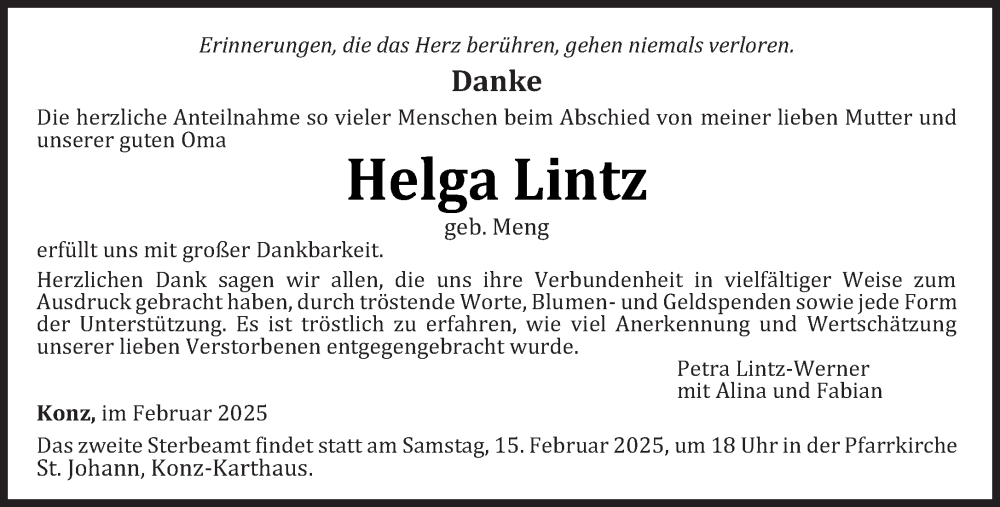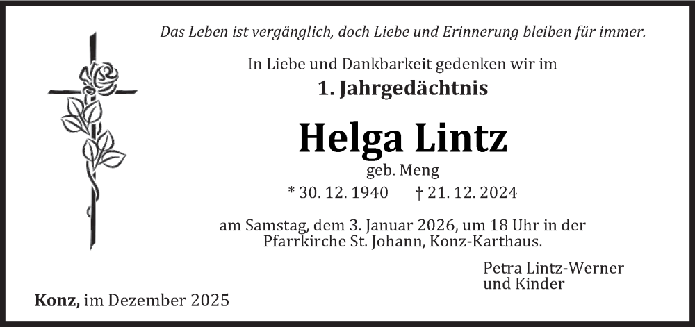 Hier finden Sie alle Traueranzeigen aus der Zeitung, die bisher für Helga Lintz erschienen sind. Weitere Traueranzeigen, die in der Zeitung erscheinen, werden hier ebenfalls aufgelistet