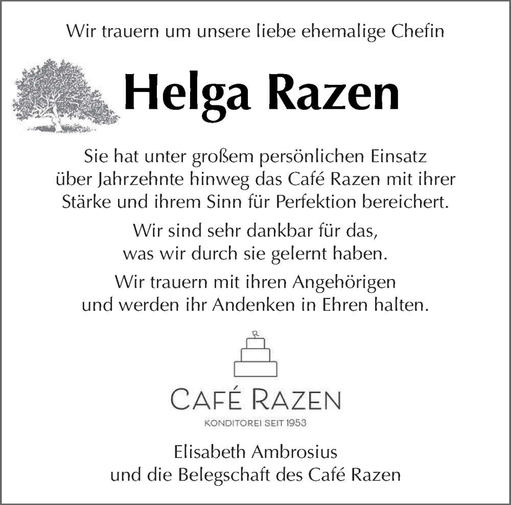 Hier finden Sie alle Traueranzeigen aus der Zeitung, die bisher für Helga Razen erschienen sind. Weitere Traueranzeigen, die in der Zeitung erscheinen, werden hier ebenfalls aufgelistet