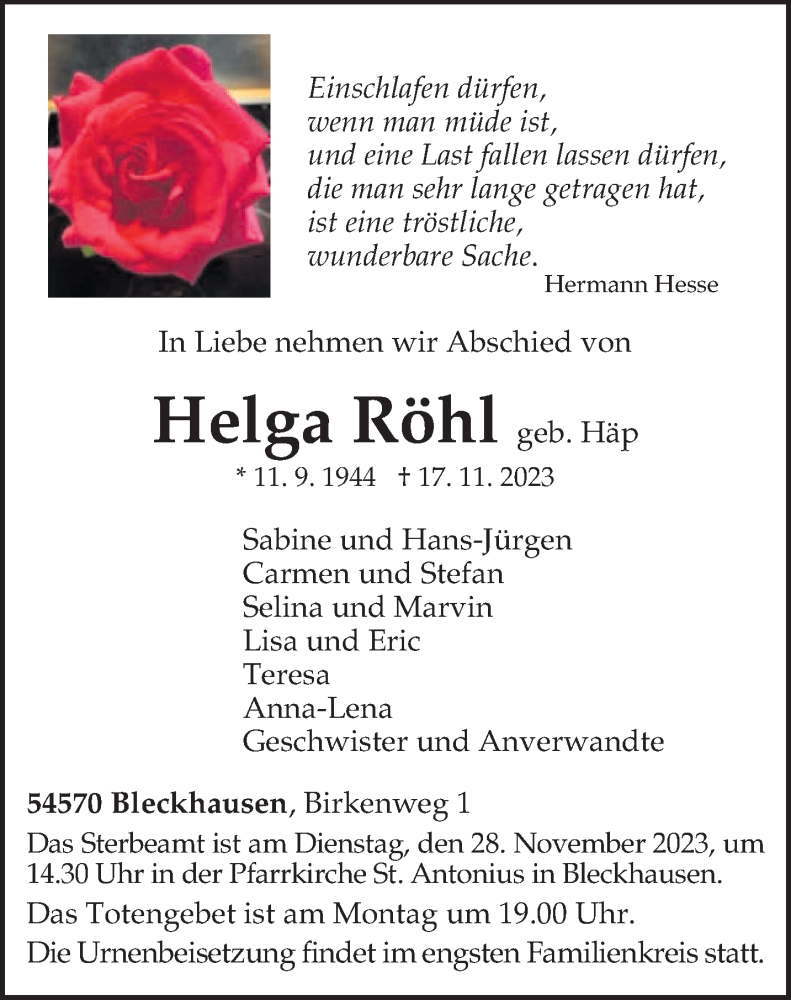 Hier finden Sie alle Traueranzeigen aus der Zeitung, die bisher für Helga Röhl erschienen sind. Weitere Traueranzeigen, die in der Zeitung erscheinen, werden hier ebenfalls aufgelistet