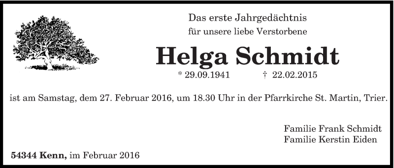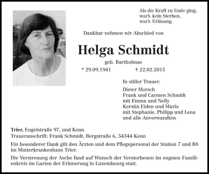 Hier finden Sie alle Traueranzeigen aus der Zeitung, die bisher für Helga Schmidt erschienen sind. Weitere Traueranzeigen, die in der Zeitung erscheinen, werden hier ebenfalls aufgelistet