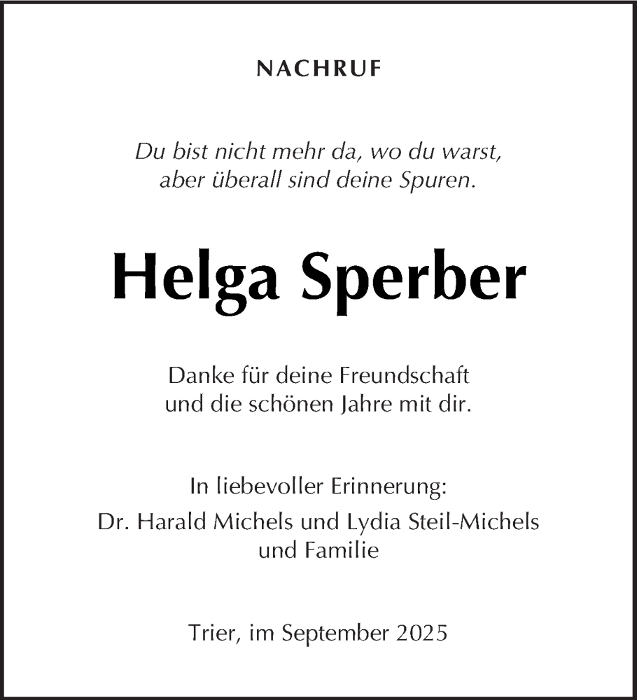 Hier finden Sie alle Traueranzeigen aus der Zeitung, die bisher für Helga Sperber erschienen sind. Weitere Traueranzeigen, die in der Zeitung erscheinen, werden hier ebenfalls aufgelistet