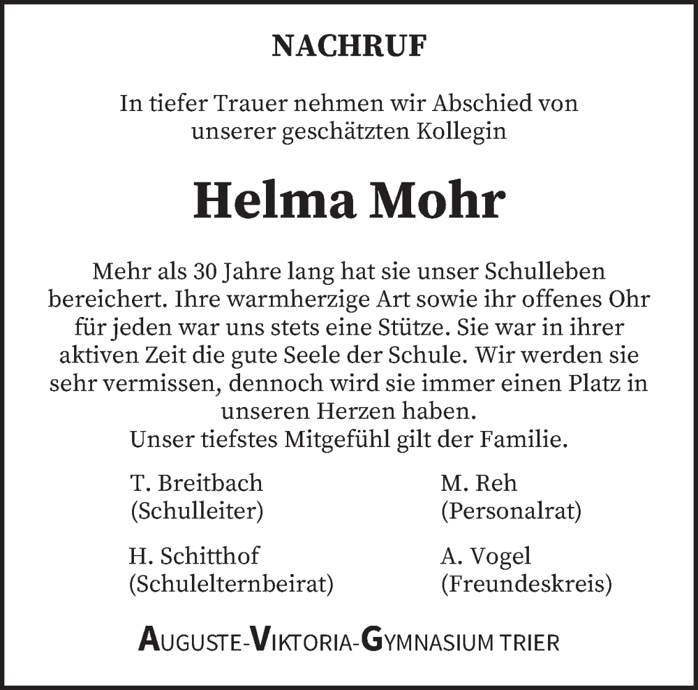 Hier finden Sie alle Traueranzeigen aus der Zeitung, die bisher für Helma Mohr erschienen sind. Weitere Traueranzeigen, die in der Zeitung erscheinen, werden hier ebenfalls aufgelistet