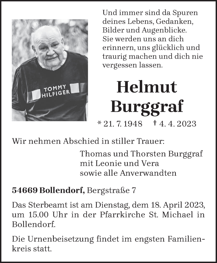 Hier finden Sie alle Traueranzeigen aus der Zeitung, die bisher für Helmut Burggraf erschienen sind. Weitere Traueranzeigen, die in der Zeitung erscheinen, werden hier ebenfalls aufgelistet