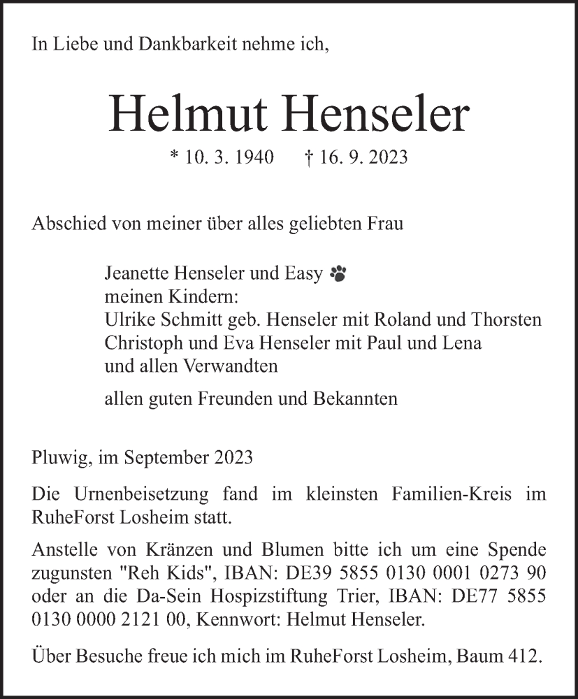 Hier finden Sie alle Traueranzeigen aus der Zeitung, die bisher für Helmut Henseler erschienen sind. Weitere Traueranzeigen, die in der Zeitung erscheinen, werden hier ebenfalls aufgelistet