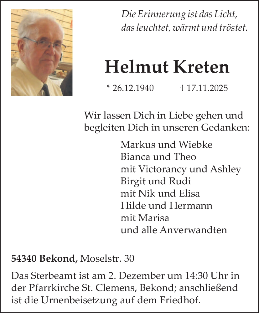 Hier finden Sie alle Traueranzeigen aus der Zeitung, die bisher für Helmut Kreten erschienen sind. Weitere Traueranzeigen, die in der Zeitung erscheinen, werden hier ebenfalls aufgelistet