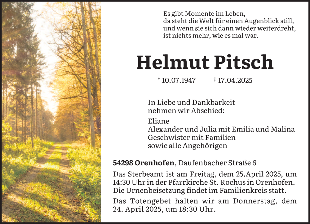 Hier finden Sie alle Traueranzeigen aus der Zeitung, die bisher für Helmut Pitsch erschienen sind. Weitere Traueranzeigen, die in der Zeitung erscheinen, werden hier ebenfalls aufgelistet