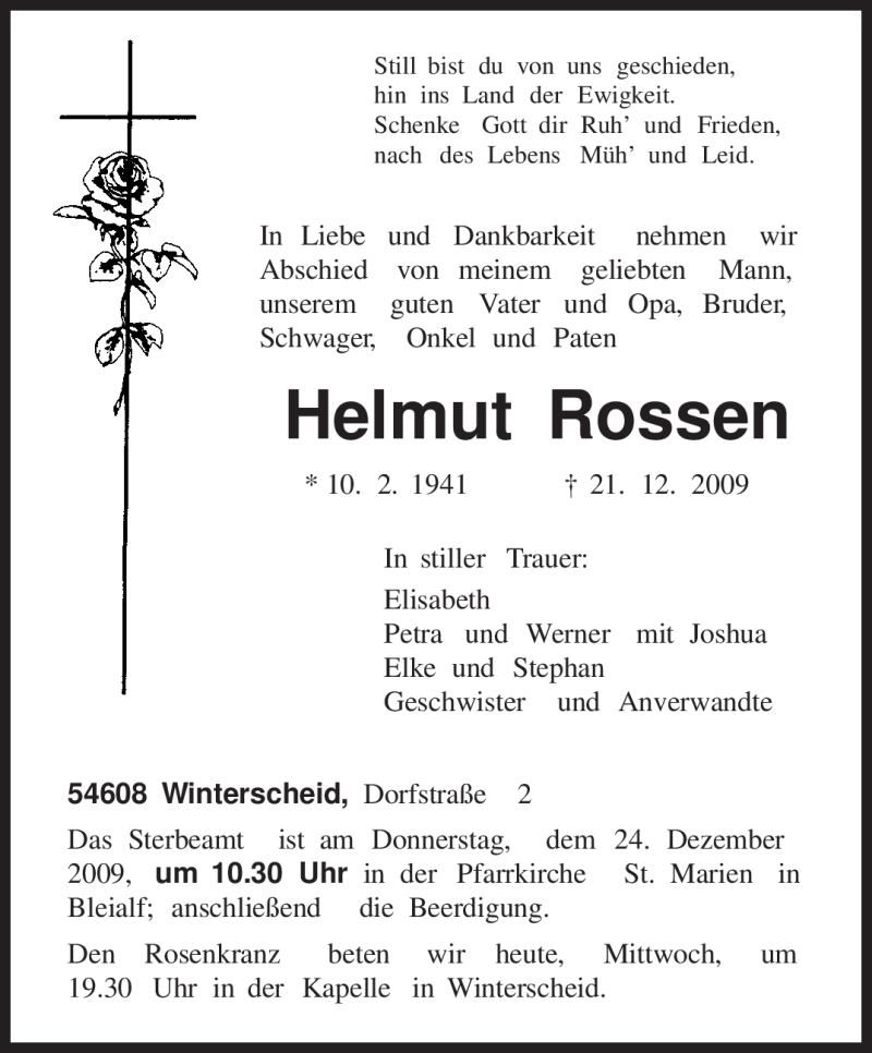 Hier finden Sie alle Traueranzeigen aus der Zeitung, die bisher für Helmut Rossen erschienen sind. Weitere Traueranzeigen, die in der Zeitung erscheinen, werden hier ebenfalls aufgelistet