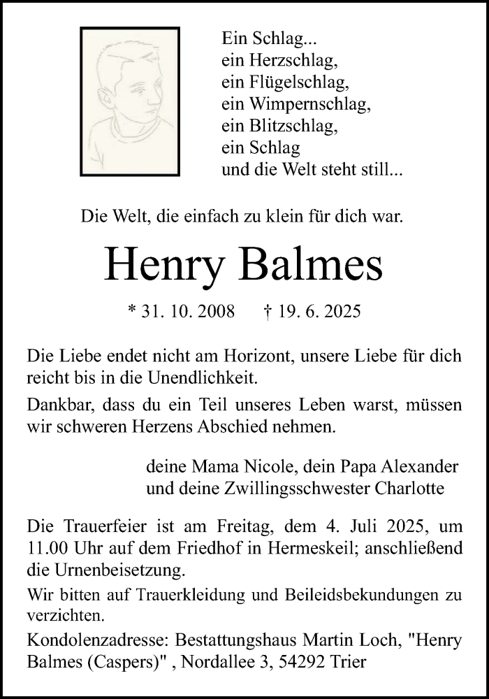 Hier finden Sie alle Traueranzeigen aus der Zeitung, die bisher für Henry Balmes erschienen sind. Weitere Traueranzeigen, die in der Zeitung erscheinen, werden hier ebenfalls aufgelistet