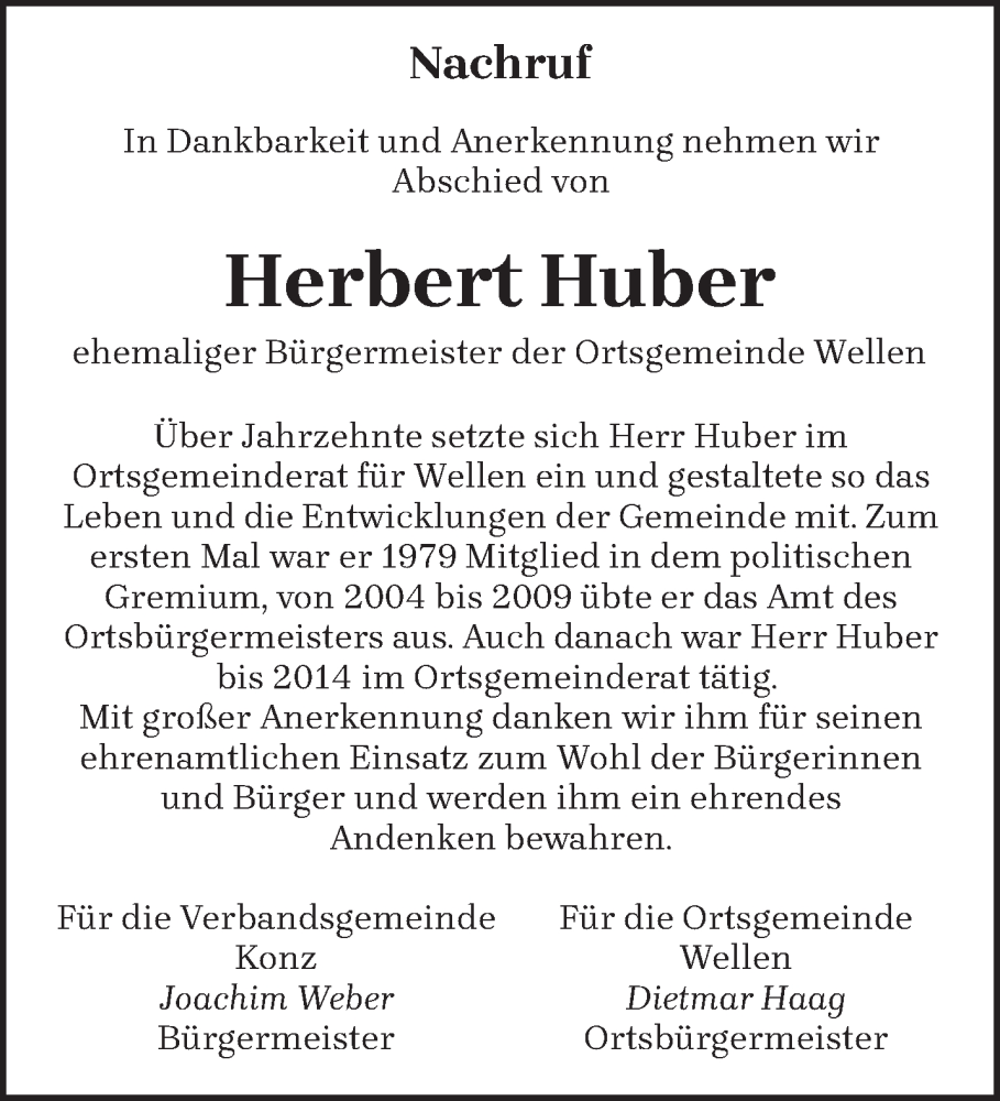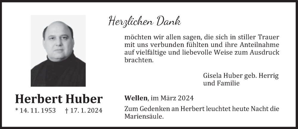 Hier finden Sie alle Traueranzeigen aus der Zeitung, die bisher für Herbert Huber erschienen sind. Weitere Traueranzeigen, die in der Zeitung erscheinen, werden hier ebenfalls aufgelistet