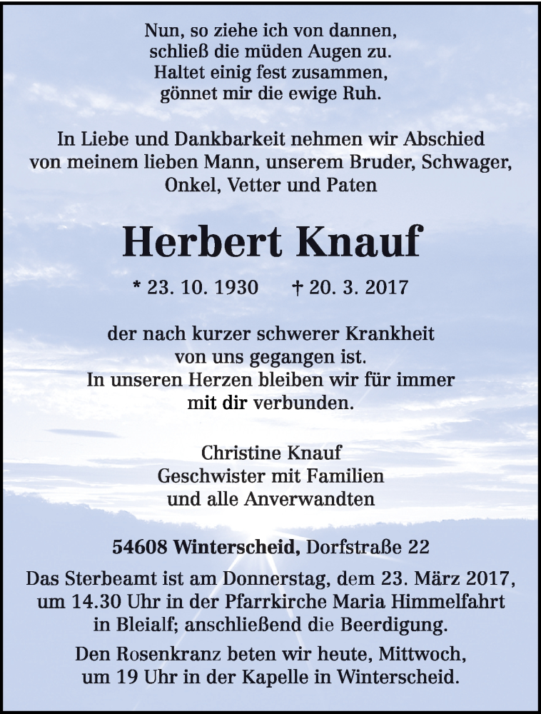 Hier finden Sie alle Traueranzeigen aus der Zeitung, die bisher für Herbert Knauf erschienen sind. Weitere Traueranzeigen, die in der Zeitung erscheinen, werden hier ebenfalls aufgelistet