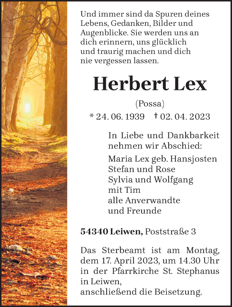 Hier finden Sie alle Traueranzeigen aus der Zeitung, die bisher für Herbert Lex erschienen sind. Weitere Traueranzeigen, die in der Zeitung erscheinen, werden hier ebenfalls aufgelistet