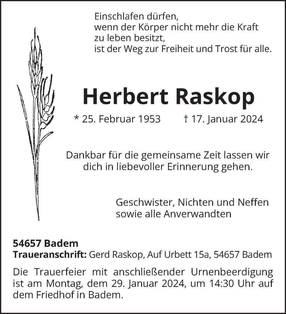Hier finden Sie alle Traueranzeigen aus der Zeitung, die bisher für Herbert Raskop erschienen sind. Weitere Traueranzeigen, die in der Zeitung erscheinen, werden hier ebenfalls aufgelistet