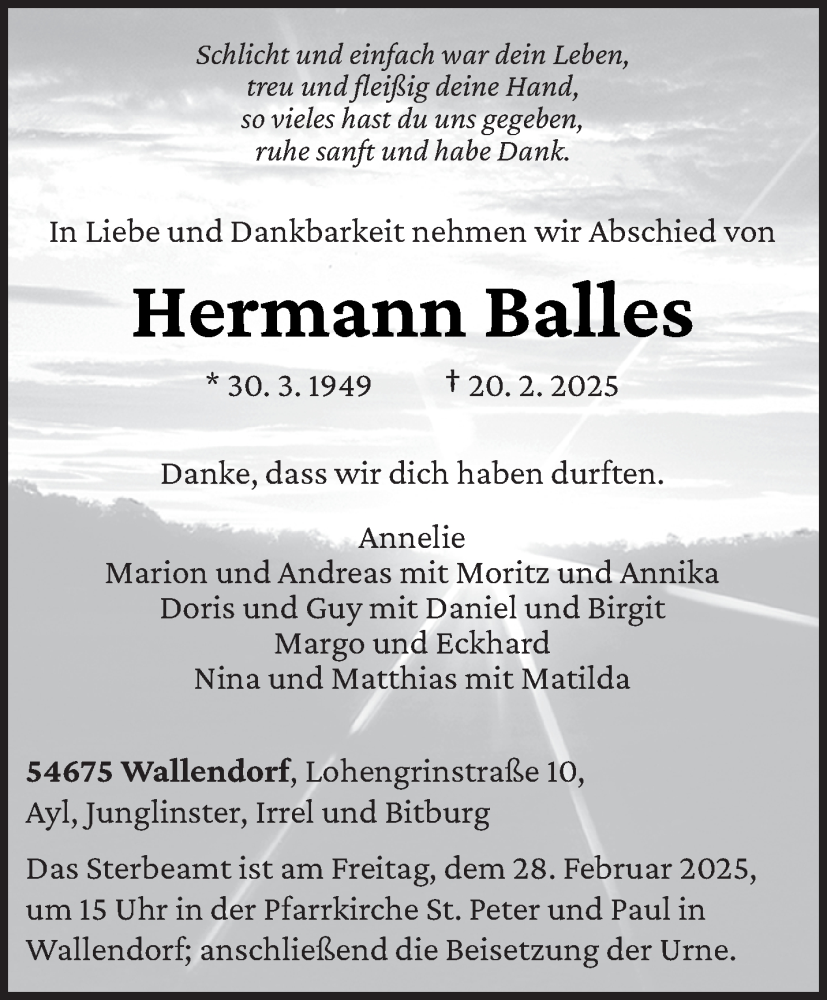 Hier finden Sie alle Traueranzeigen aus der Zeitung, die bisher für Hermann Balles erschienen sind. Weitere Traueranzeigen, die in der Zeitung erscheinen, werden hier ebenfalls aufgelistet