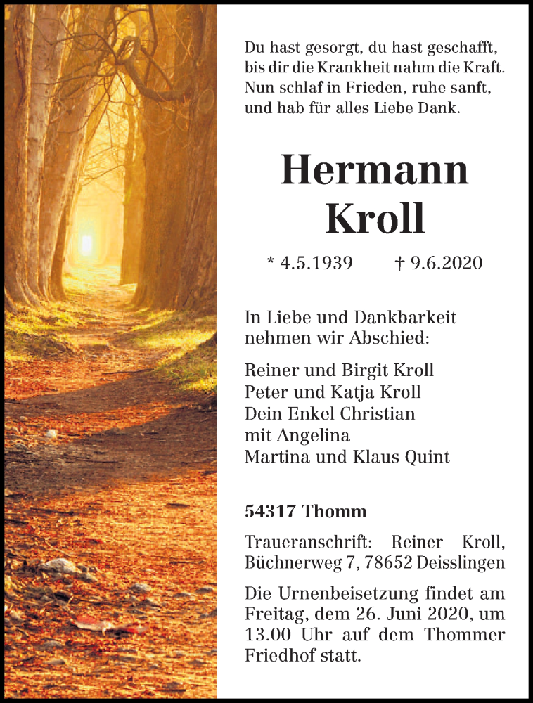Hier finden Sie alle Traueranzeigen aus der Zeitung, die bisher für Hermann Kroll erschienen sind. Weitere Traueranzeigen, die in der Zeitung erscheinen, werden hier ebenfalls aufgelistet