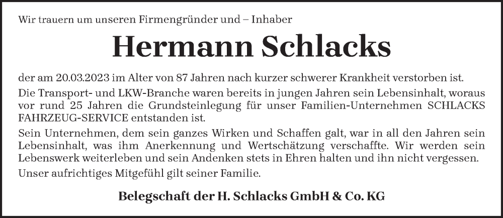 Hier finden Sie alle Traueranzeigen aus der Zeitung, die bisher für Hermann Schlacks erschienen sind. Weitere Traueranzeigen, die in der Zeitung erscheinen, werden hier ebenfalls aufgelistet