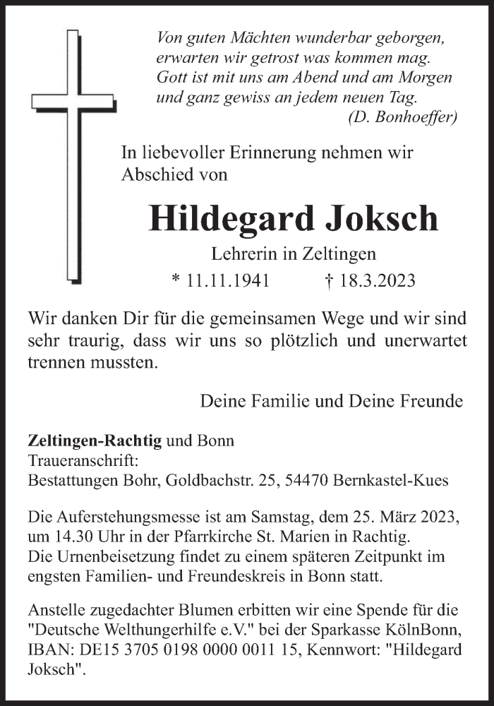 Hier finden Sie alle Traueranzeigen aus der Zeitung, die bisher für Hildegard Joksch erschienen sind. Weitere Traueranzeigen, die in der Zeitung erscheinen, werden hier ebenfalls aufgelistet
