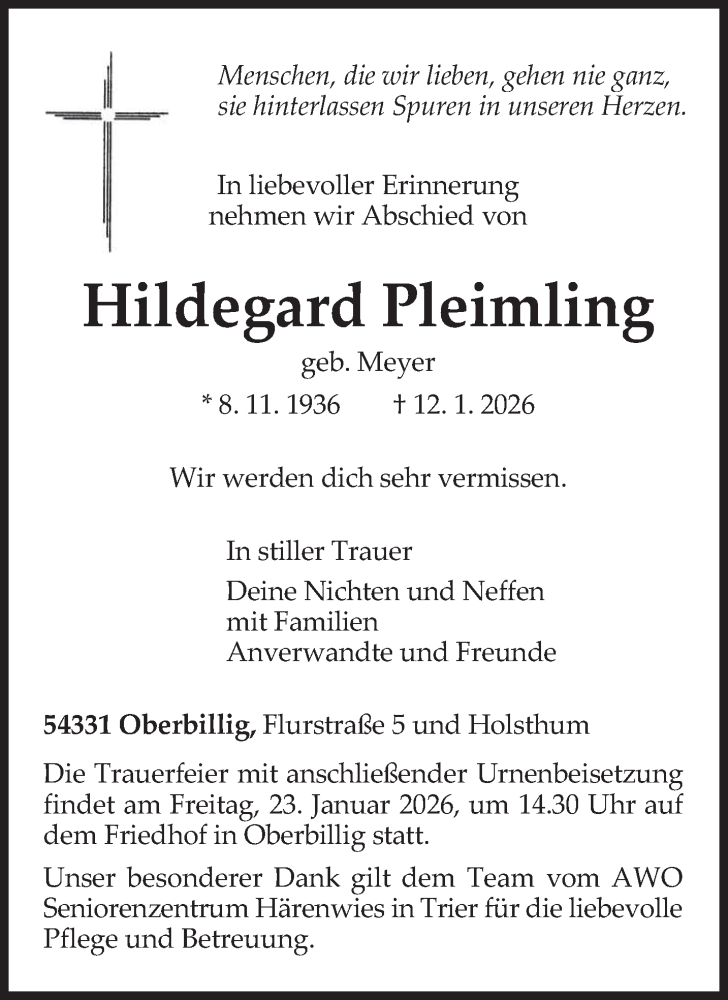 Hier finden Sie alle Traueranzeigen aus der Zeitung, die bisher für Hildegard Pleimling erschienen sind. Weitere Traueranzeigen, die in der Zeitung erscheinen, werden hier ebenfalls aufgelistet