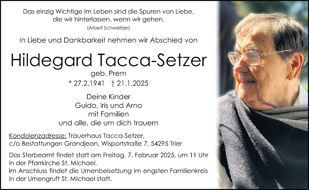 Hier finden Sie alle Traueranzeigen aus der Zeitung, die bisher für Hildegard Tacca-Setzer erschienen sind. Weitere Traueranzeigen, die in der Zeitung erscheinen, werden hier ebenfalls aufgelistet