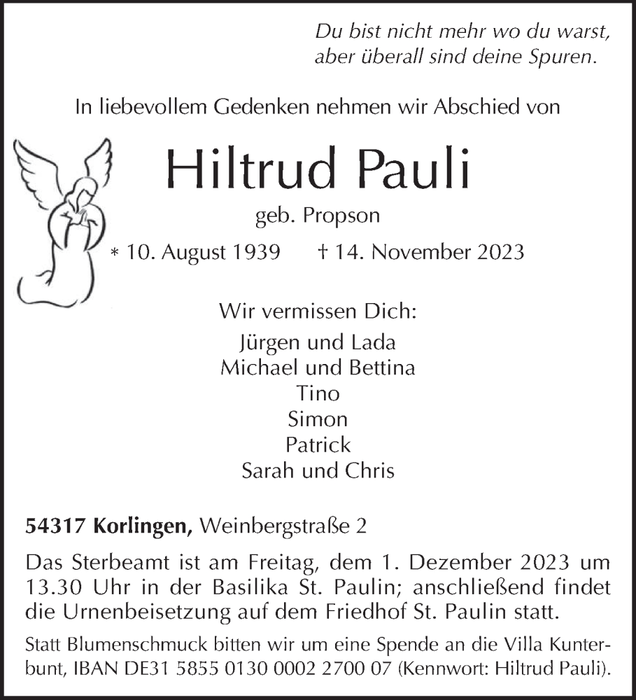 Hier finden Sie alle Traueranzeigen aus der Zeitung, die bisher für Hiltrud Pauli erschienen sind. Weitere Traueranzeigen, die in der Zeitung erscheinen, werden hier ebenfalls aufgelistet