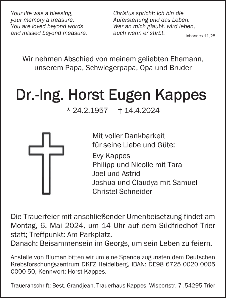Hier finden Sie alle Traueranzeigen aus der Zeitung, die bisher für Horst Eugen Kappes erschienen sind. Weitere Traueranzeigen, die in der Zeitung erscheinen, werden hier ebenfalls aufgelistet