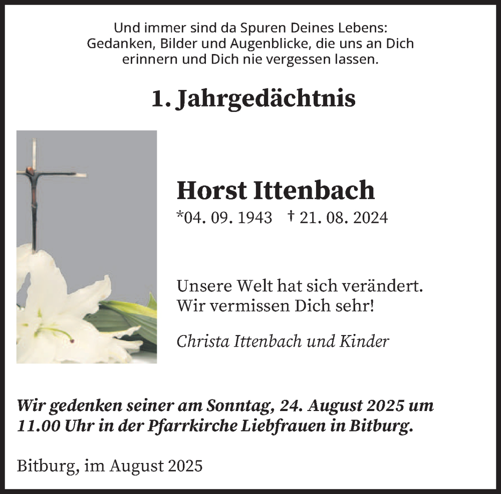 Hier finden Sie alle Traueranzeigen aus der Zeitung, die bisher für Horst Ittenbach erschienen sind. Weitere Traueranzeigen, die in der Zeitung erscheinen, werden hier ebenfalls aufgelistet