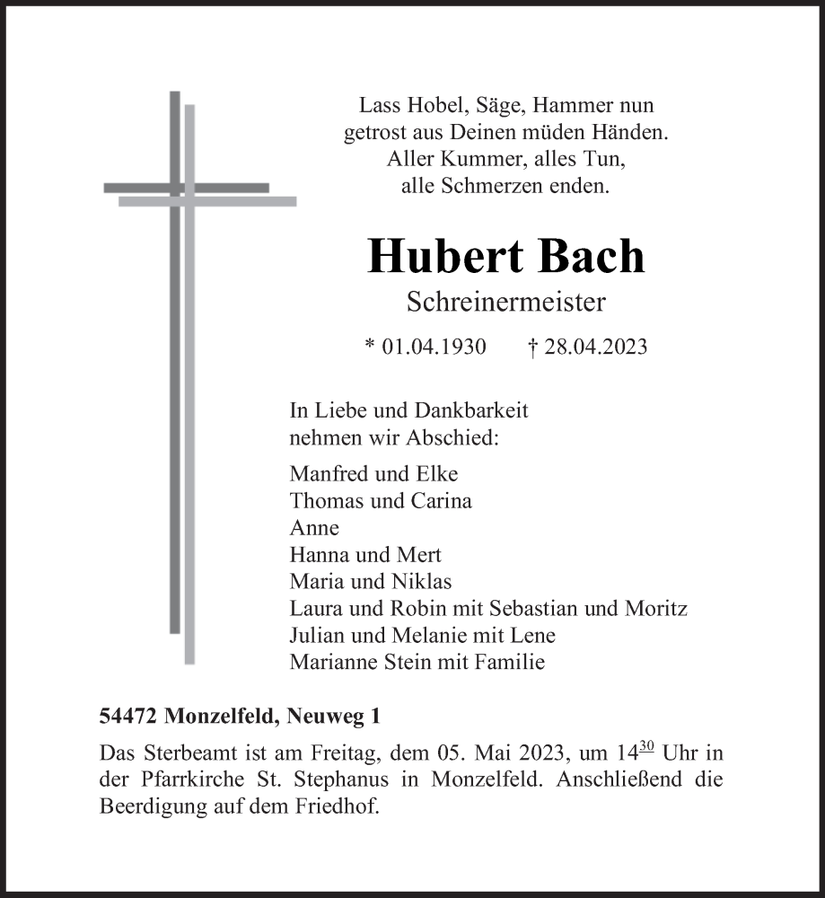 Hier finden Sie alle Traueranzeigen aus der Zeitung, die bisher für Hubert Bach erschienen sind. Weitere Traueranzeigen, die in der Zeitung erscheinen, werden hier ebenfalls aufgelistet