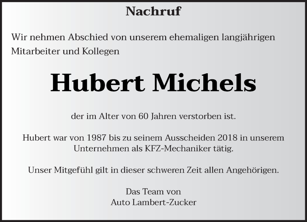 Hier finden Sie alle Traueranzeigen aus der Zeitung, die bisher für Hubert Michels erschienen sind. Weitere Traueranzeigen, die in der Zeitung erscheinen, werden hier ebenfalls aufgelistet