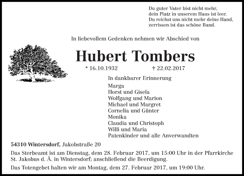 Hier finden Sie alle Traueranzeigen aus der Zeitung, die bisher für Hubert Tombers erschienen sind. Weitere Traueranzeigen, die in der Zeitung erscheinen, werden hier ebenfalls aufgelistet