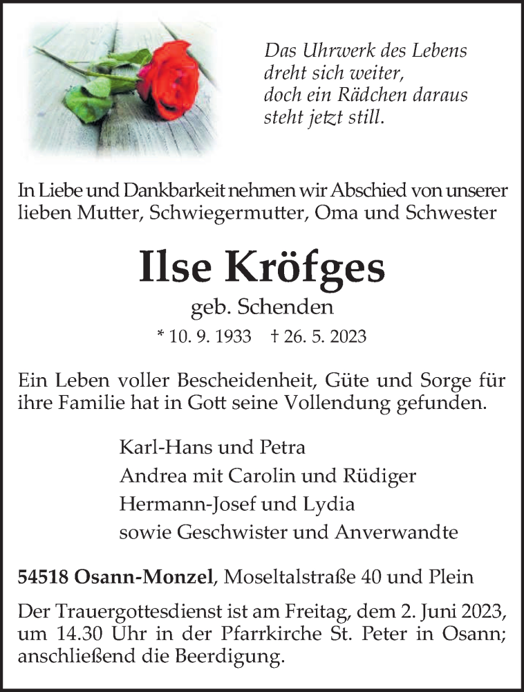 Hier finden Sie alle Traueranzeigen aus der Zeitung, die bisher für Ilse Kröfges erschienen sind. Weitere Traueranzeigen, die in der Zeitung erscheinen, werden hier ebenfalls aufgelistet