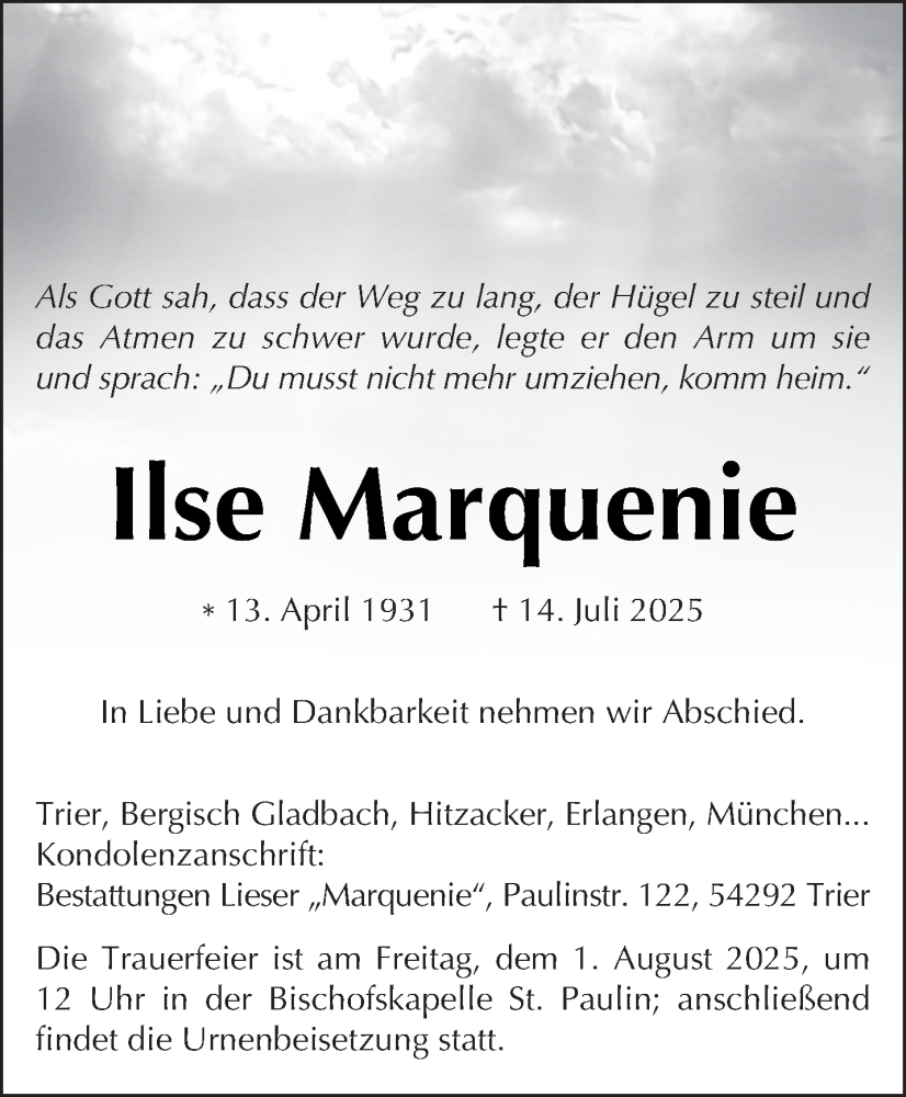 Hier finden Sie alle Traueranzeigen aus der Zeitung, die bisher für Ilse Marquenie erschienen sind. Weitere Traueranzeigen, die in der Zeitung erscheinen, werden hier ebenfalls aufgelistet