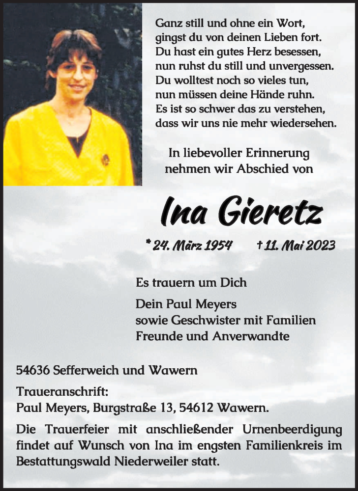 Hier finden Sie alle Traueranzeigen aus der Zeitung, die bisher für Ina Gieretz erschienen sind. Weitere Traueranzeigen, die in der Zeitung erscheinen, werden hier ebenfalls aufgelistet