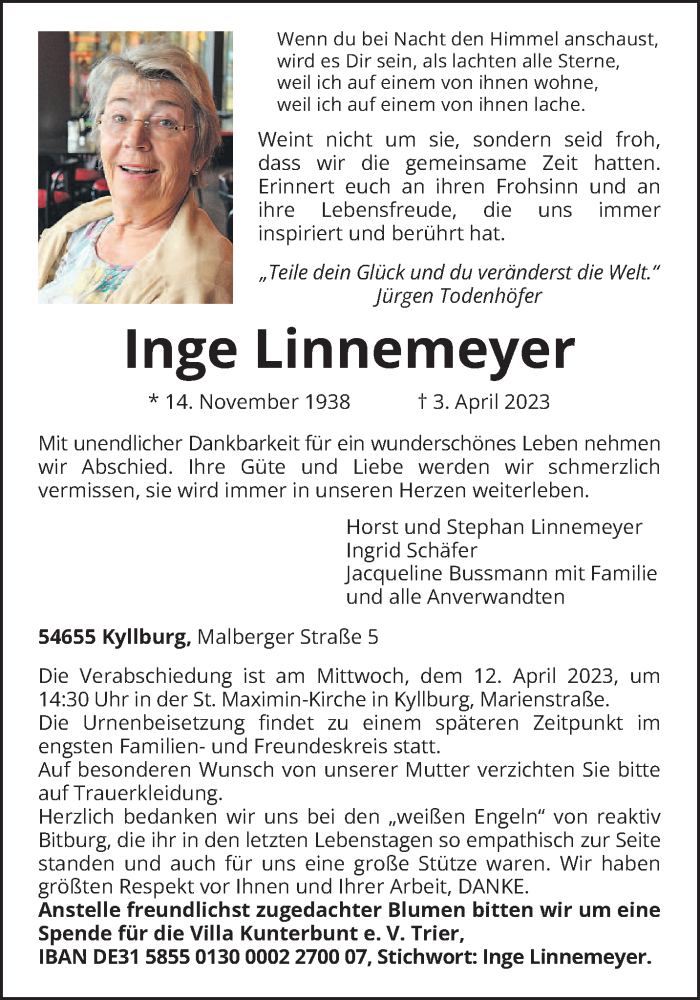 Hier finden Sie alle Traueranzeigen aus der Zeitung, die bisher für Inge Linnemeyer erschienen sind. Weitere Traueranzeigen, die in der Zeitung erscheinen, werden hier ebenfalls aufgelistet