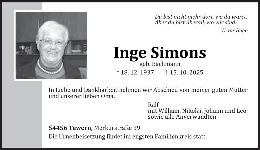 Hier finden Sie alle Traueranzeigen aus der Zeitung, die bisher für Inge Simons erschienen sind. Weitere Traueranzeigen, die in der Zeitung erscheinen, werden hier ebenfalls aufgelistet
