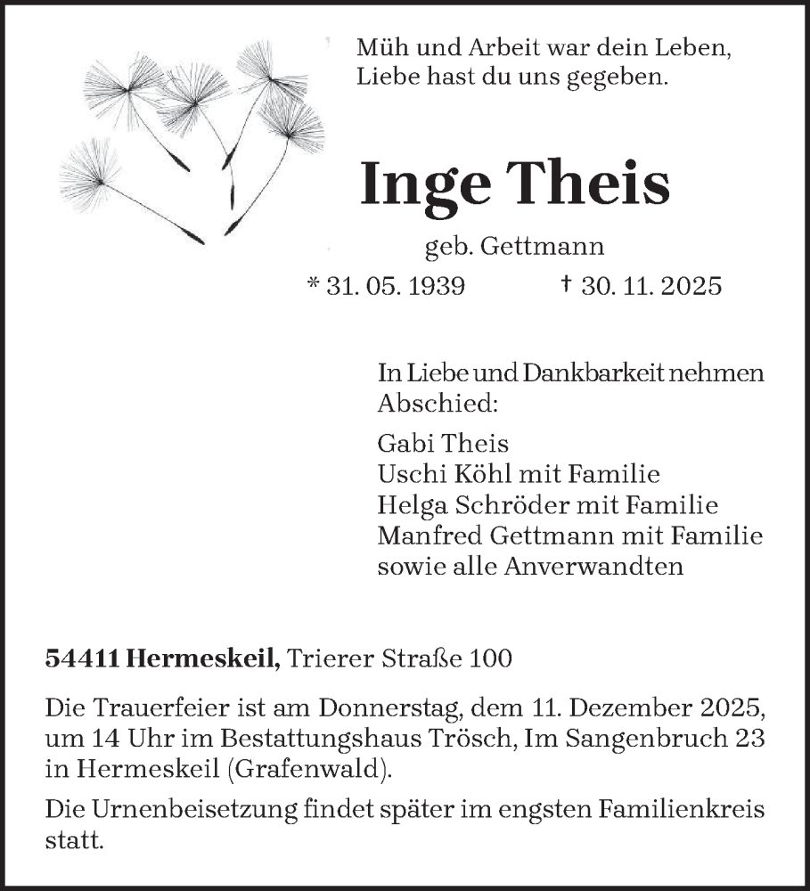 Hier finden Sie alle Traueranzeigen aus der Zeitung, die bisher für Inge Theis erschienen sind. Weitere Traueranzeigen, die in der Zeitung erscheinen, werden hier ebenfalls aufgelistet
