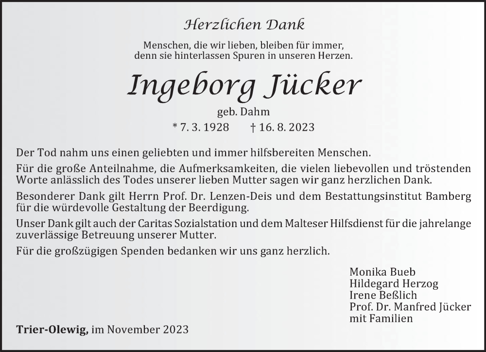 Hier finden Sie alle Traueranzeigen aus der Zeitung, die bisher für Ingeborg Jücker erschienen sind. Weitere Traueranzeigen, die in der Zeitung erscheinen, werden hier ebenfalls aufgelistet
