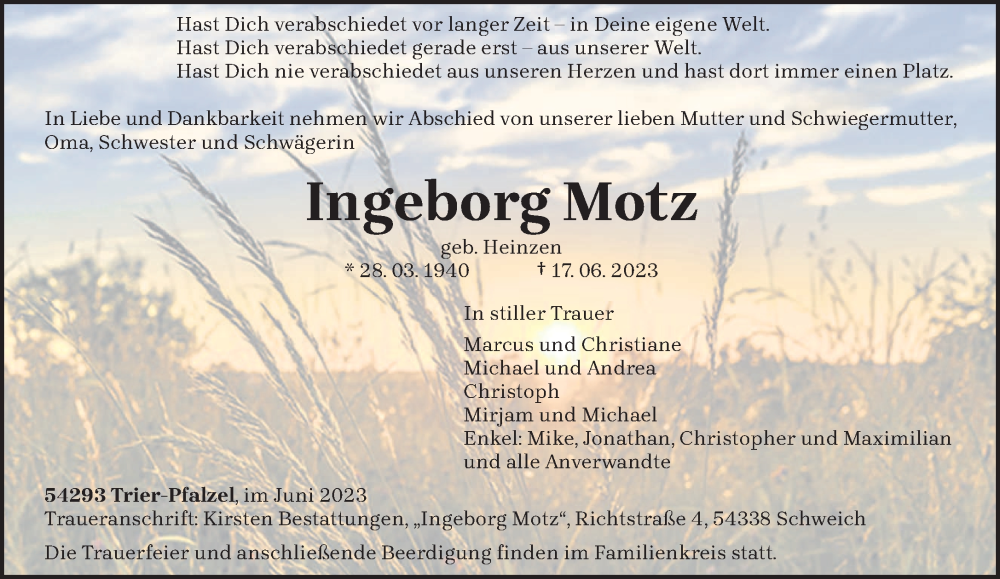 Hier finden Sie alle Traueranzeigen aus der Zeitung, die bisher für Ingeborg Motz erschienen sind. Weitere Traueranzeigen, die in der Zeitung erscheinen, werden hier ebenfalls aufgelistet