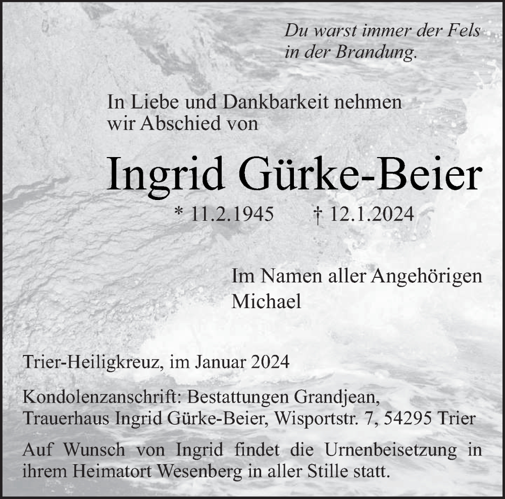 Hier finden Sie alle Traueranzeigen aus der Zeitung, die bisher für Ingrid Gürke-Beier erschienen sind. Weitere Traueranzeigen, die in der Zeitung erscheinen, werden hier ebenfalls aufgelistet