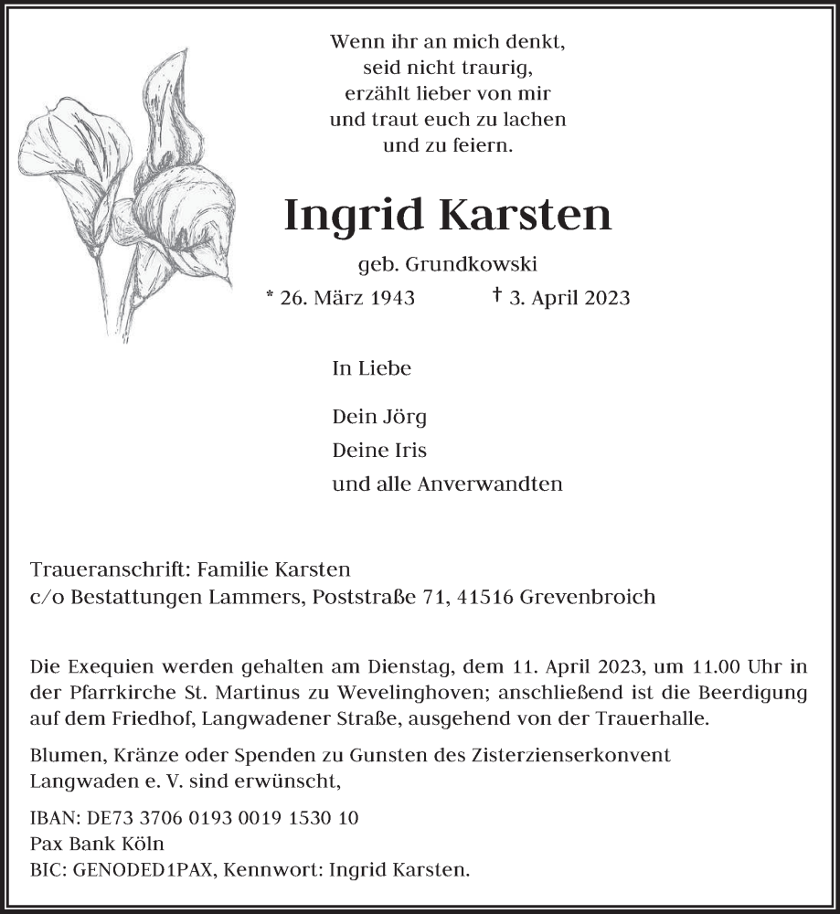 Hier finden Sie alle Traueranzeigen aus der Zeitung, die bisher für Ingrid Karsten erschienen sind. Weitere Traueranzeigen, die in der Zeitung erscheinen, werden hier ebenfalls aufgelistet