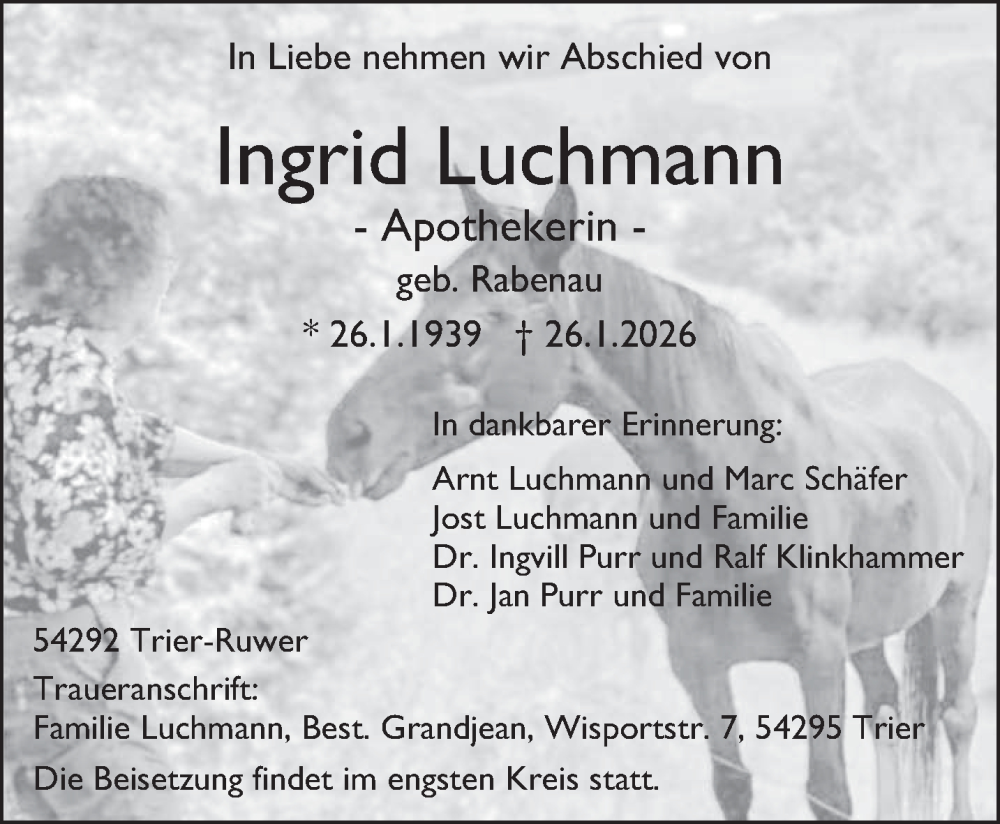 Hier finden Sie alle Traueranzeigen aus der Zeitung, die bisher für Ingrid Luchmann erschienen sind. Weitere Traueranzeigen, die in der Zeitung erscheinen, werden hier ebenfalls aufgelistet