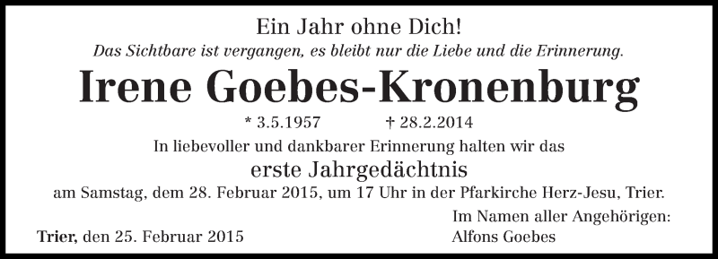 Hier finden Sie alle Traueranzeigen aus der Zeitung, die bisher für Irene Goebes-Kronenburg erschienen sind. Weitere Traueranzeigen, die in der Zeitung erscheinen, werden hier ebenfalls aufgelistet