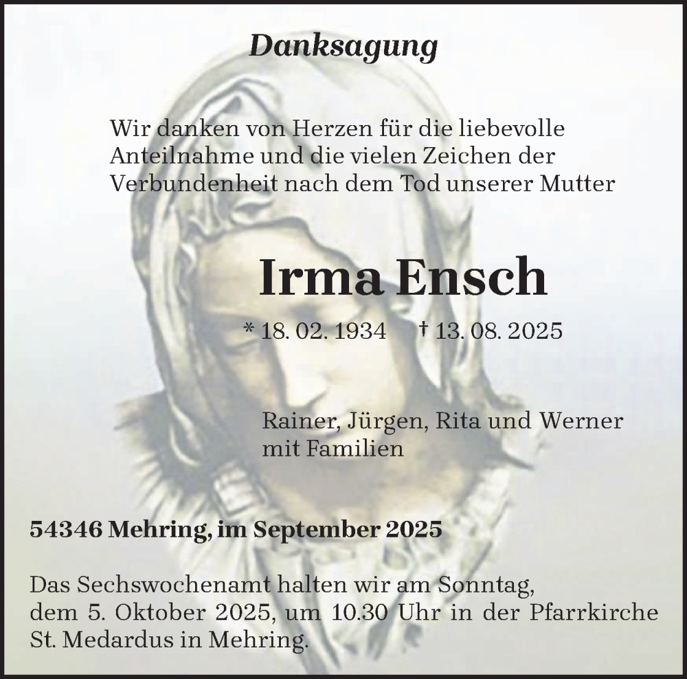 Hier finden Sie alle Traueranzeigen aus der Zeitung, die bisher für Irma Ensch erschienen sind. Weitere Traueranzeigen, die in der Zeitung erscheinen, werden hier ebenfalls aufgelistet