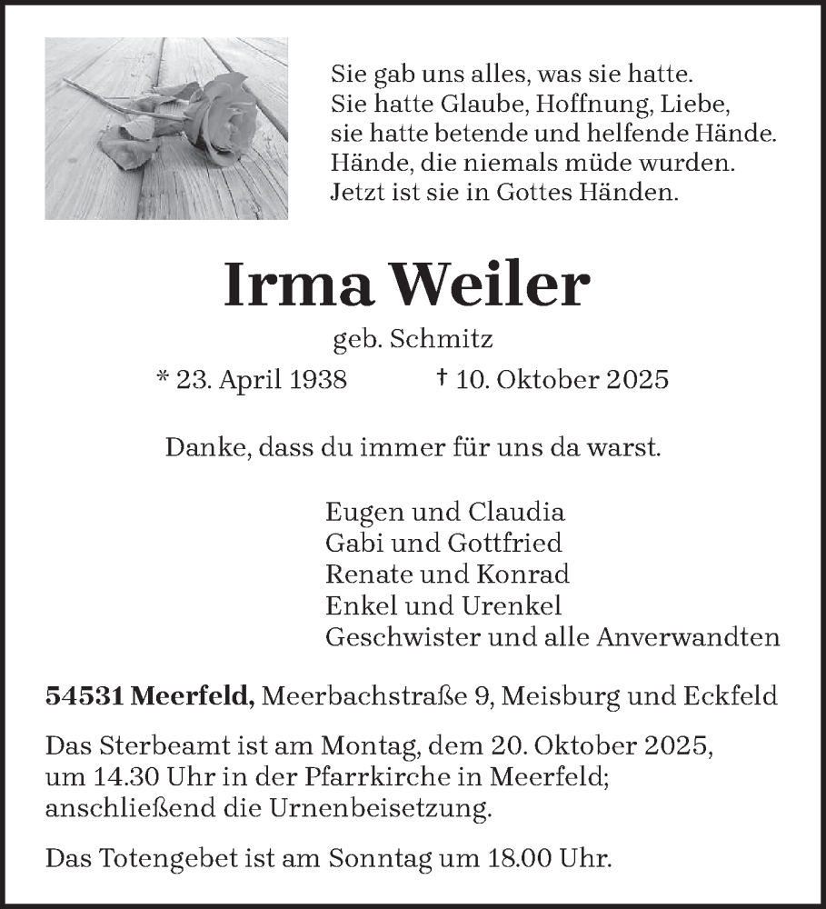 Hier finden Sie alle Traueranzeigen aus der Zeitung, die bisher für Irma Weiler erschienen sind. Weitere Traueranzeigen, die in der Zeitung erscheinen, werden hier ebenfalls aufgelistet