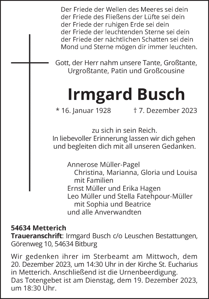 Hier finden Sie alle Traueranzeigen aus der Zeitung, die bisher für Irmgard Busch erschienen sind. Weitere Traueranzeigen, die in der Zeitung erscheinen, werden hier ebenfalls aufgelistet
