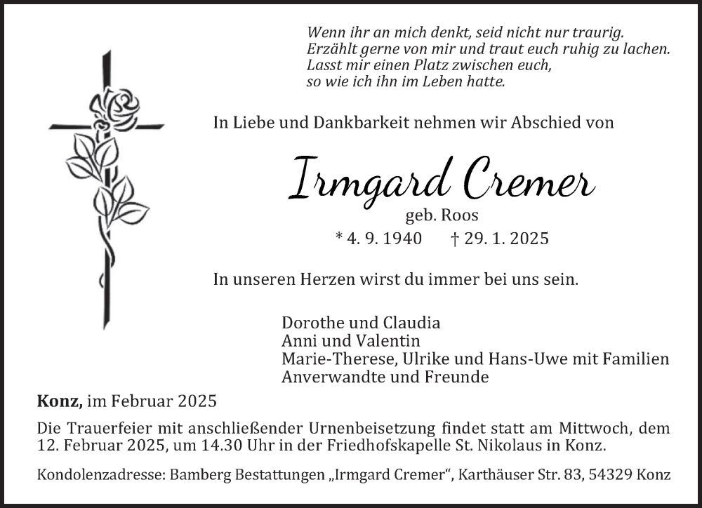 Hier finden Sie alle Traueranzeigen aus der Zeitung, die bisher für Irmgard Cremer erschienen sind. Weitere Traueranzeigen, die in der Zeitung erscheinen, werden hier ebenfalls aufgelistet