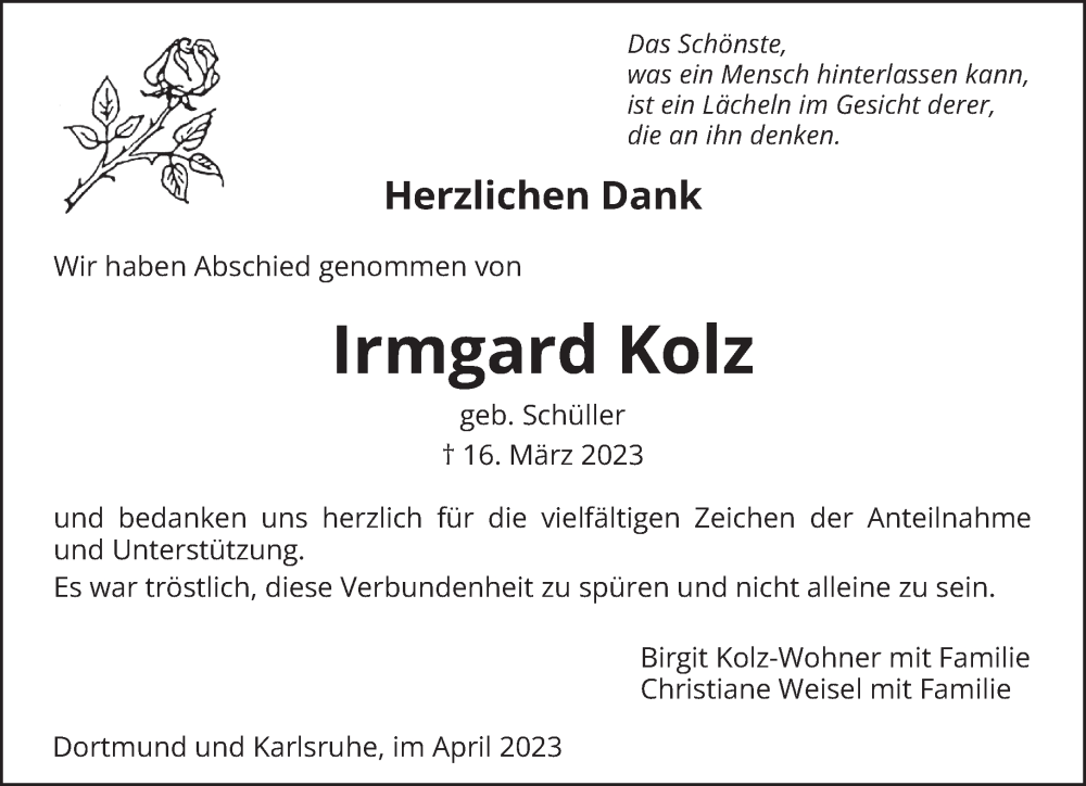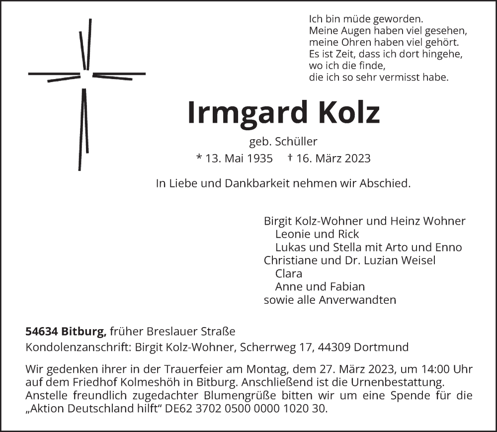 Hier finden Sie alle Traueranzeigen aus der Zeitung, die bisher für Irmgard Kolz erschienen sind. Weitere Traueranzeigen, die in der Zeitung erscheinen, werden hier ebenfalls aufgelistet