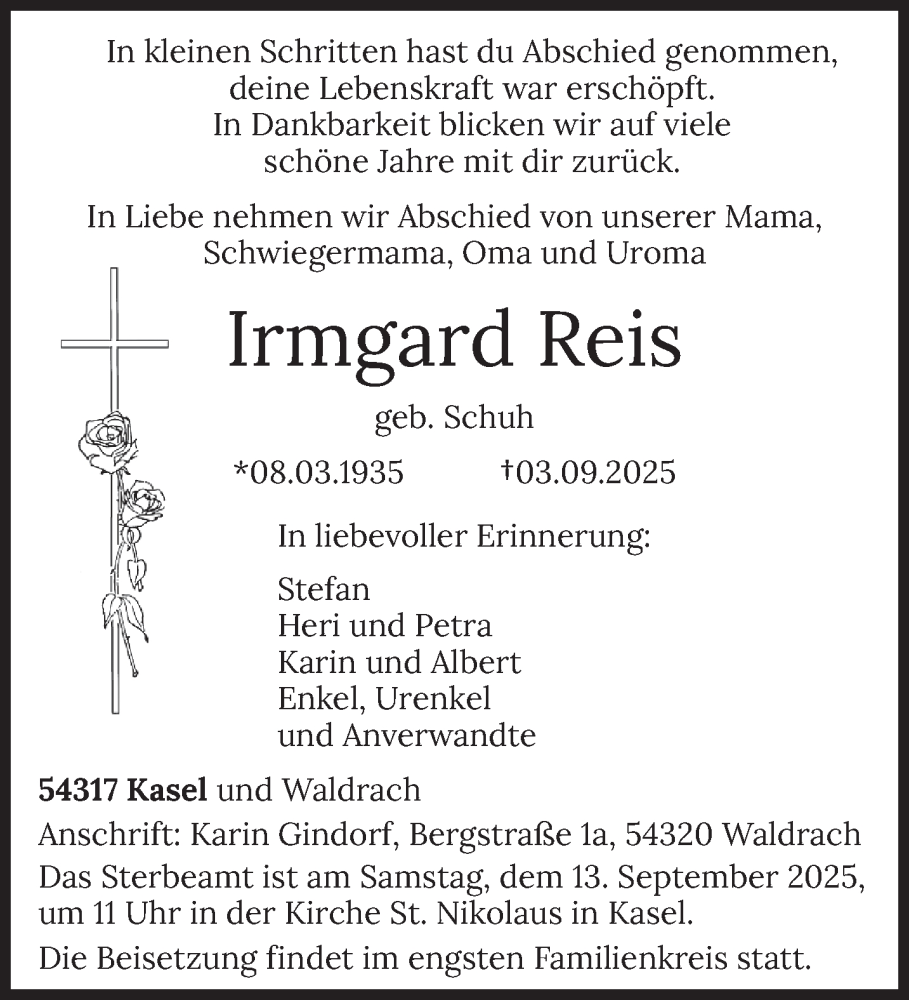 Hier finden Sie alle Traueranzeigen aus der Zeitung, die bisher für Irmgard Reis erschienen sind. Weitere Traueranzeigen, die in der Zeitung erscheinen, werden hier ebenfalls aufgelistet