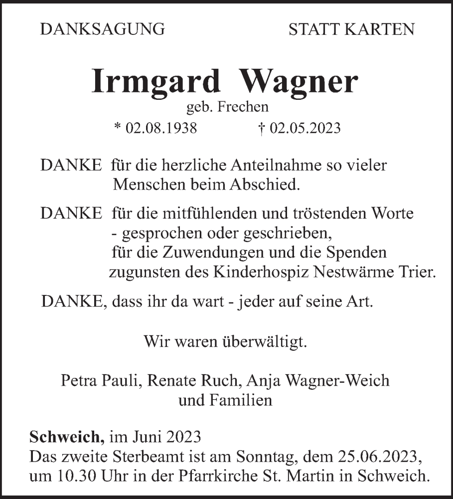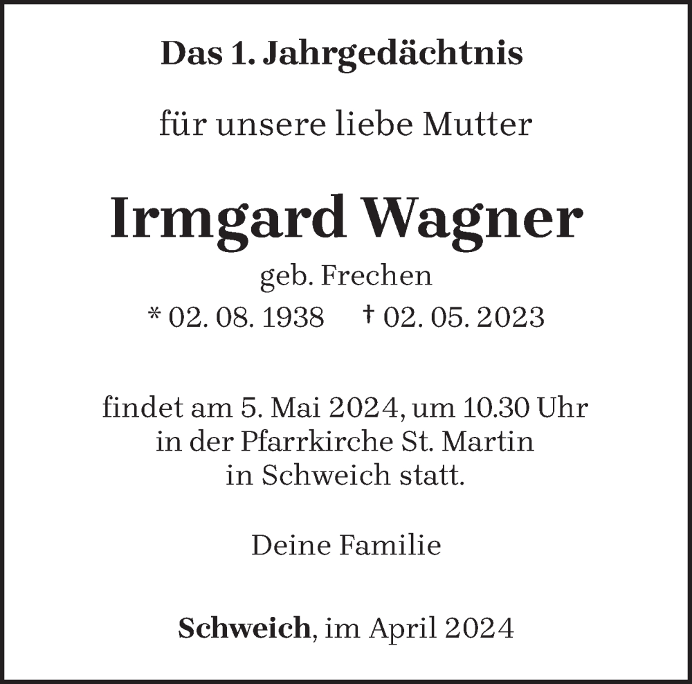 Hier finden Sie alle Traueranzeigen aus der Zeitung, die bisher für Irmgard Wagner erschienen sind. Weitere Traueranzeigen, die in der Zeitung erscheinen, werden hier ebenfalls aufgelistet