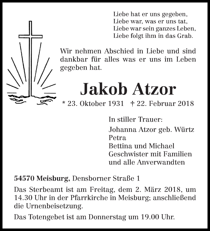 Hier finden Sie alle Traueranzeigen aus der Zeitung, die bisher für Jakob Atzor erschienen sind. Weitere Traueranzeigen, die in der Zeitung erscheinen, werden hier ebenfalls aufgelistet