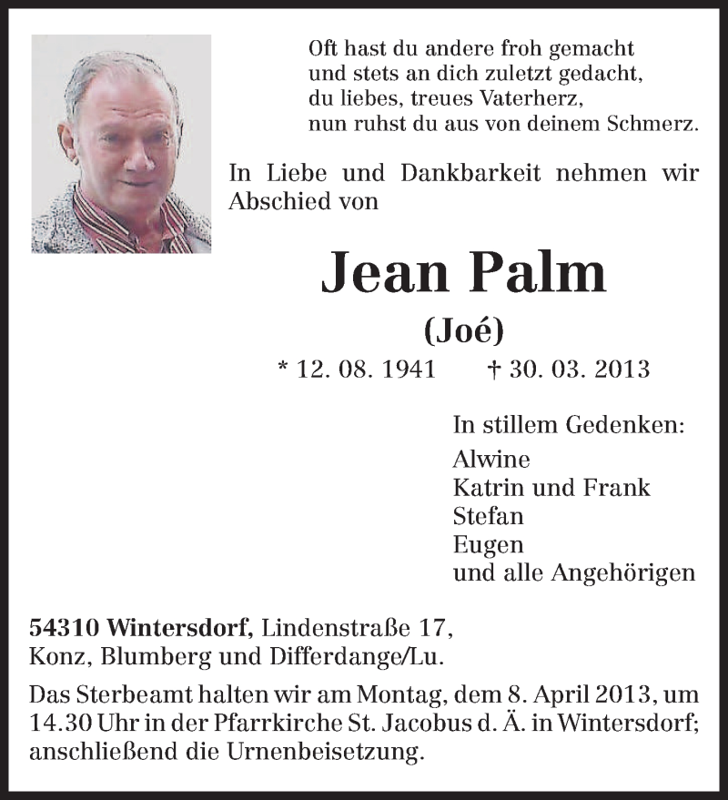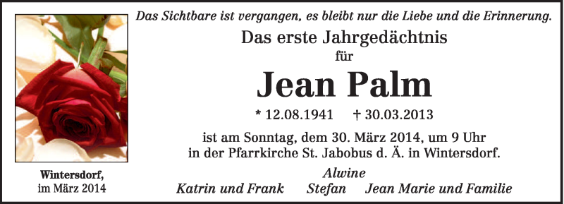Hier finden Sie alle Traueranzeigen aus der Zeitung, die bisher für Jean Palm erschienen sind. Weitere Traueranzeigen, die in der Zeitung erscheinen, werden hier ebenfalls aufgelistet